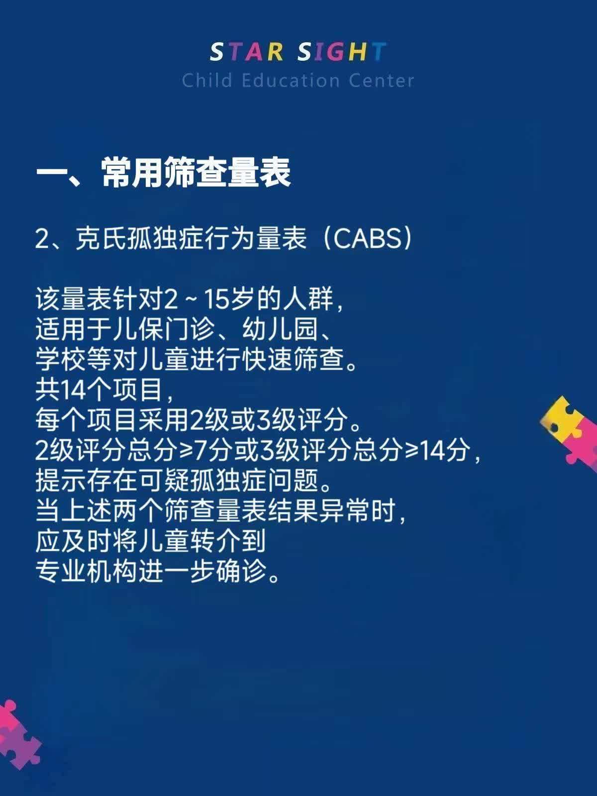 以上就是介绍的自闭症检测孩工具。其实,自闭症(孤独症)并没有那么可怕。在医学上,自闭症谱系障碍的诊断范围极其广泛,被确诊的孩子可能是高智商的,也有智力障碍的,也可能是健谈的,或是少语的,也有情感丰富的,或是淡漠的。客观地讲,自闭症谱系障碍中有约30%的病例属于严重障碍,大部分自闭症谱系障碍孩子是中度或轻度,通过科学有效的干预能够得到显著改善。